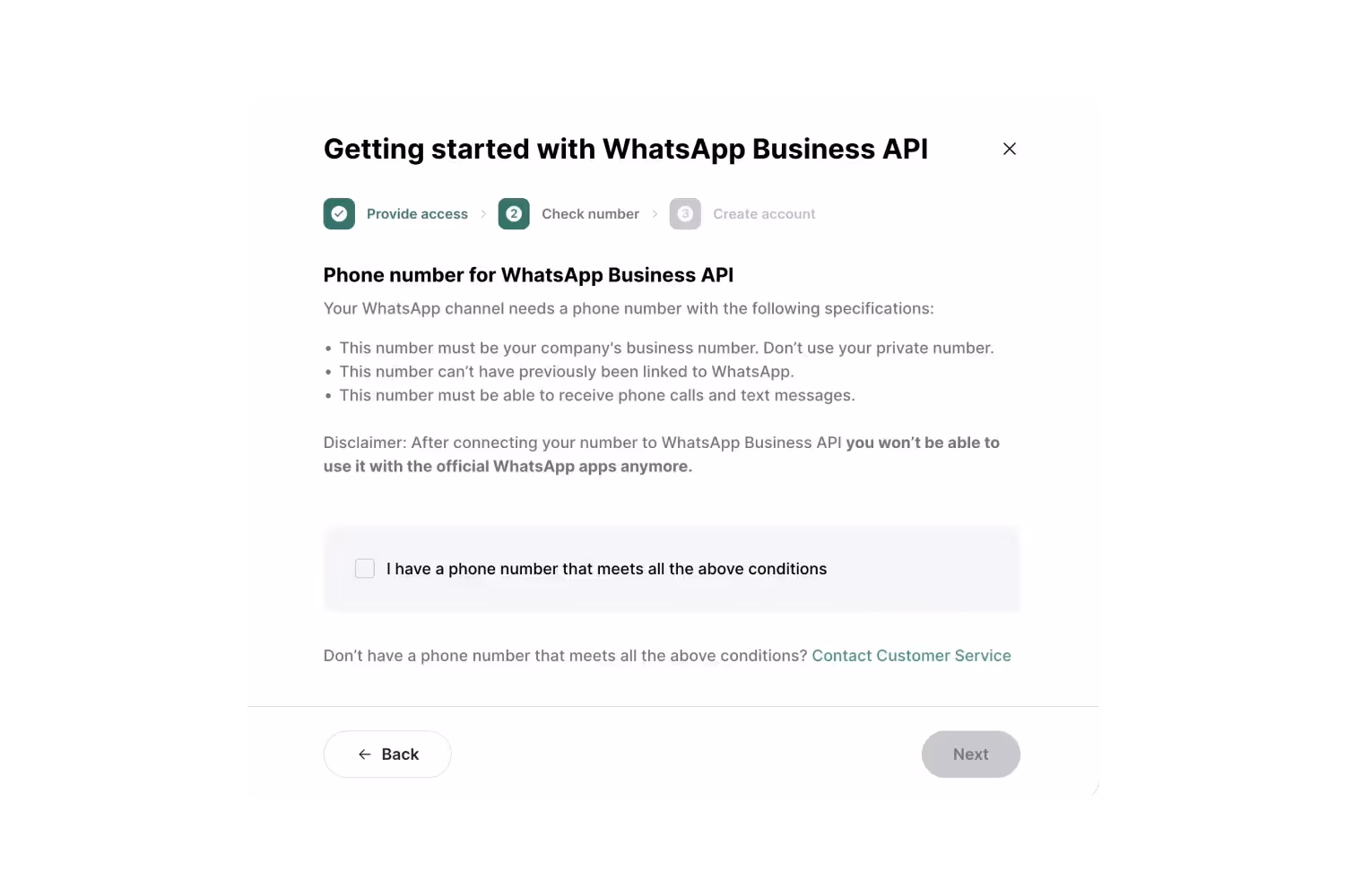 7. Check if your phone number meets all the conditions Trengo shows you. If not, email us at [email protected].