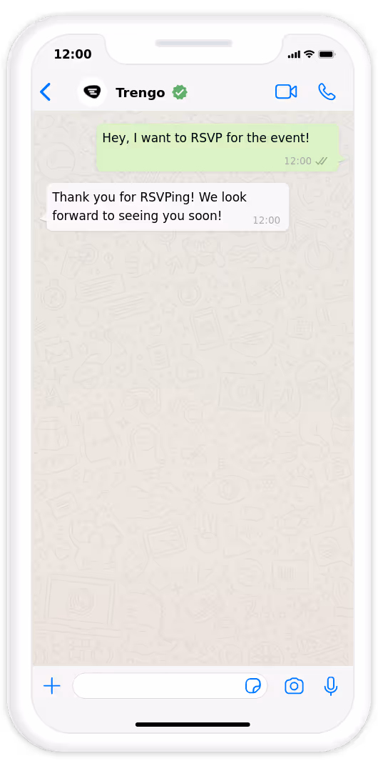 For that, you’ll have to create a click-to-chat link with a pre-filled message. When people click this link they will start a conversation with your WhatsApp Business account with a message ready to be sent: “Hey, I want to RSVP for the event!” They’ll only have to hit ‘send’ to RSVP for the event. Just like that.