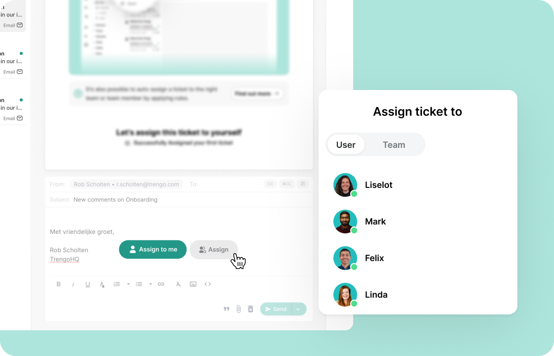 ¿Hay alguna pregunta sobre pedidos o sobre facturas? No hay necesidad de revisar todos los mensajes individualmente. Asígnelos directamente al equipo adecuado mediante la automatización. El miembro del equipo adecuado con conocimientos sobre ese tema específico puede recogerlo y responder rápidamente. De este modo, las consultas de los clientes llegan directamente a la persona responsable de gestionarlas.