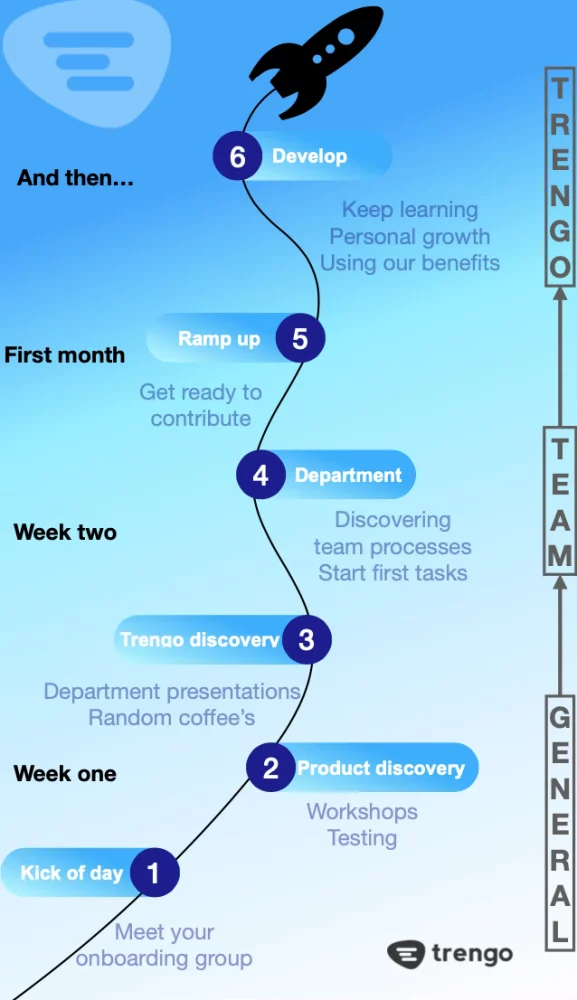 En Trengo lo hacemos de forma similar. El primer día, apenas se toca el portátil. Nos centramos en que todo el mundo se sienta bienvenido, se conozca y establezca sus expectativas. Todo el mundo (¡sí, de verdad!) sigue la misma formación durante la primera semana, independientemente de la experiencia que tengas. A partir de ese momento, se imparte una formación específica para cada equipo.