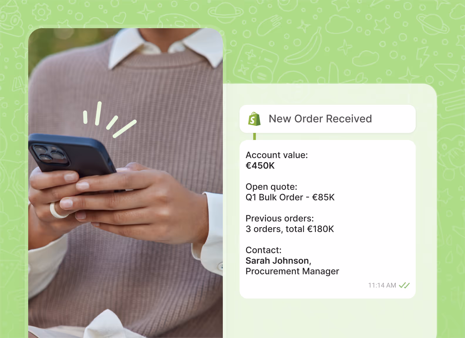 Consulte el valor de la cuenta, los pedidos anteriores, las cotizaciones abiertas y los contactos del comité de compras directamente en la bandeja de entrada mientras chatea con los compradores. Sepa al instante si se trata de una oportunidad de 5000 € o de 500 000 €.