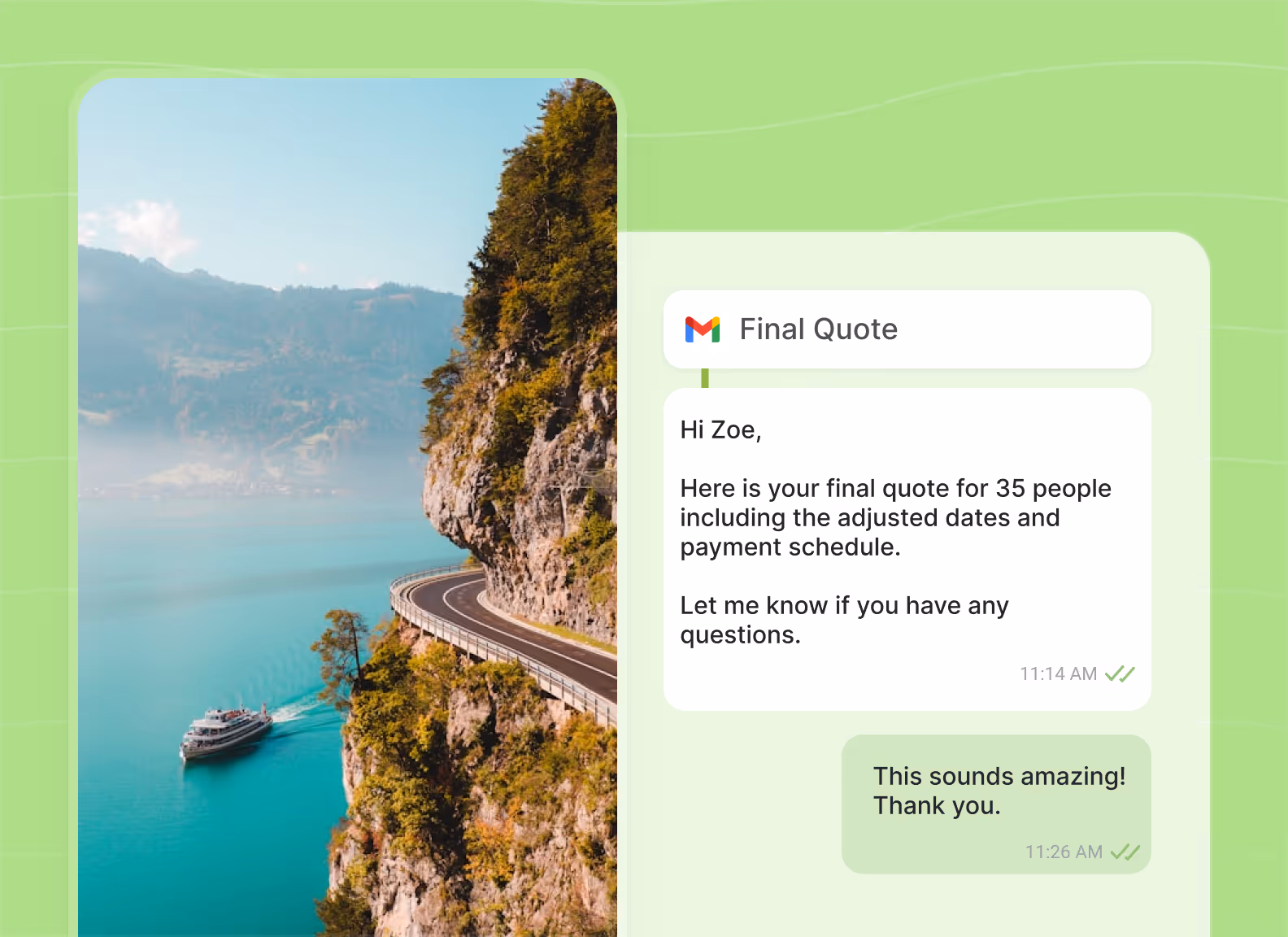 Coordínese con hoteles, transporte y guías en un solo hilo compartido, sin necesidad de reenviar correos electrónicos.