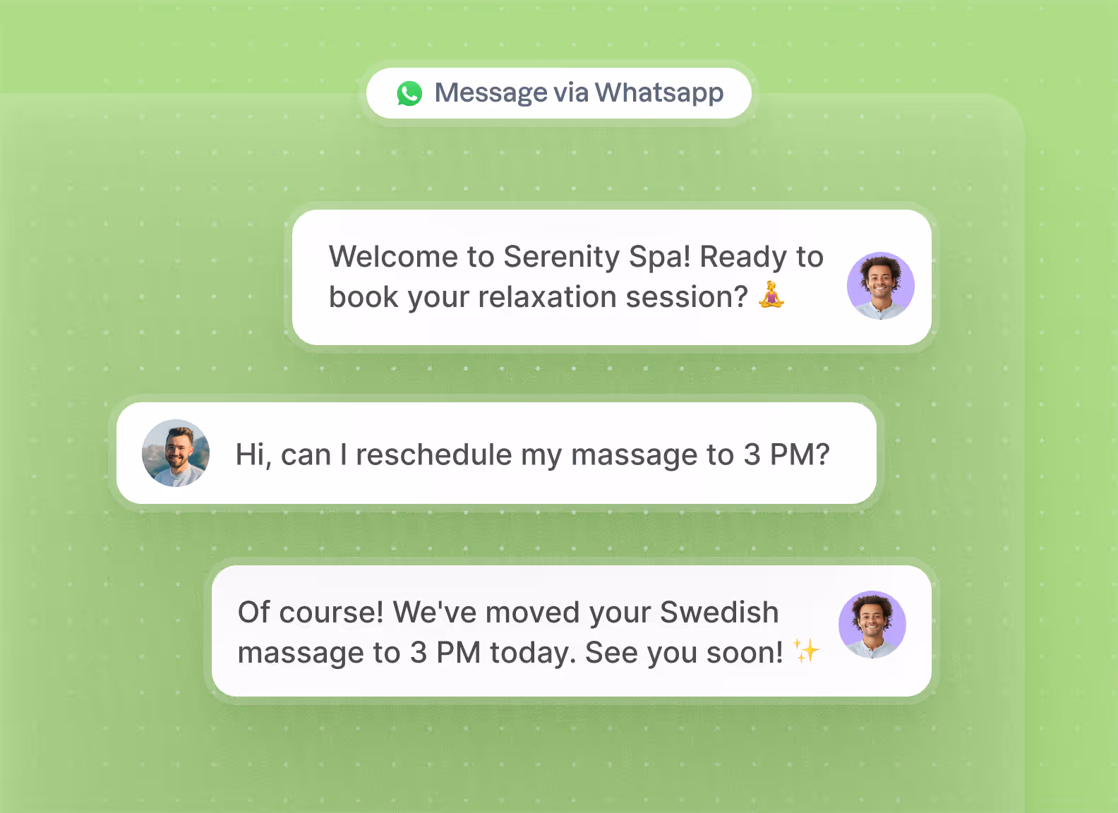 Deja que Trengo se encargue de las confirmaciones, los recordatorios y las preguntas frecuentes, para que tu equipo pueda centrarse en crear experiencias de bienestar memorables que merezcan valoraciones de 5 estrellas.