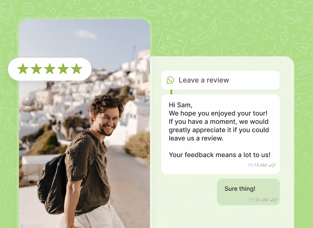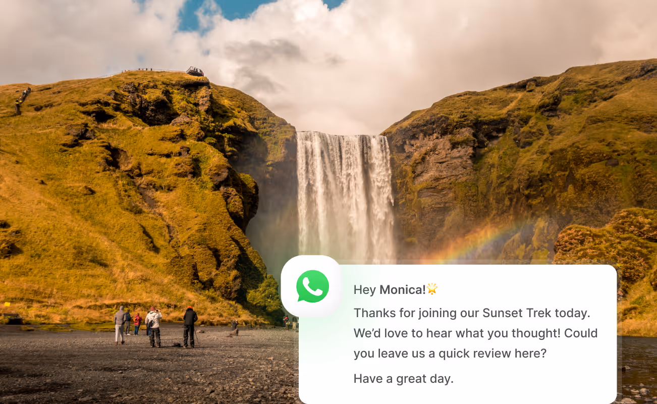 Captura el entusiasmo de los huéspedes en la «hora dorada» con solicitudes de reseñas automatizadas por WhatsApp enviadas 60 minutos después de la visita. WhatsApp tiene una tasa de apertura del 98 %, frente al 20 % del correo electrónico. Más reseñas, capturadas más rápido.