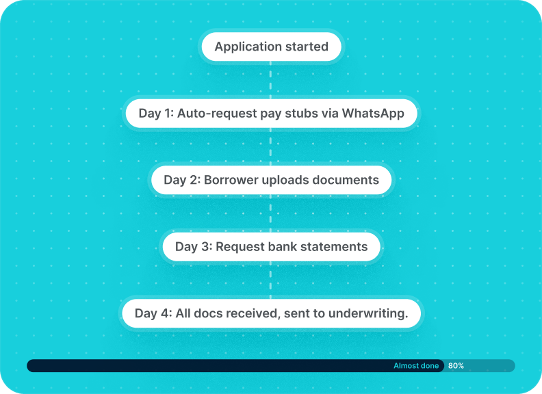 Utilise des séquences WhatsApp automatiques pour demander des documents spécifiques au bon moment. Les emprunteurs les téléchargent depuis leur téléphone en quelques secondes, et les fichiers se synchronisent directement avec ton système LOS. Ce qui prenait avant 2 semaines ne prend plus que 3 jours.