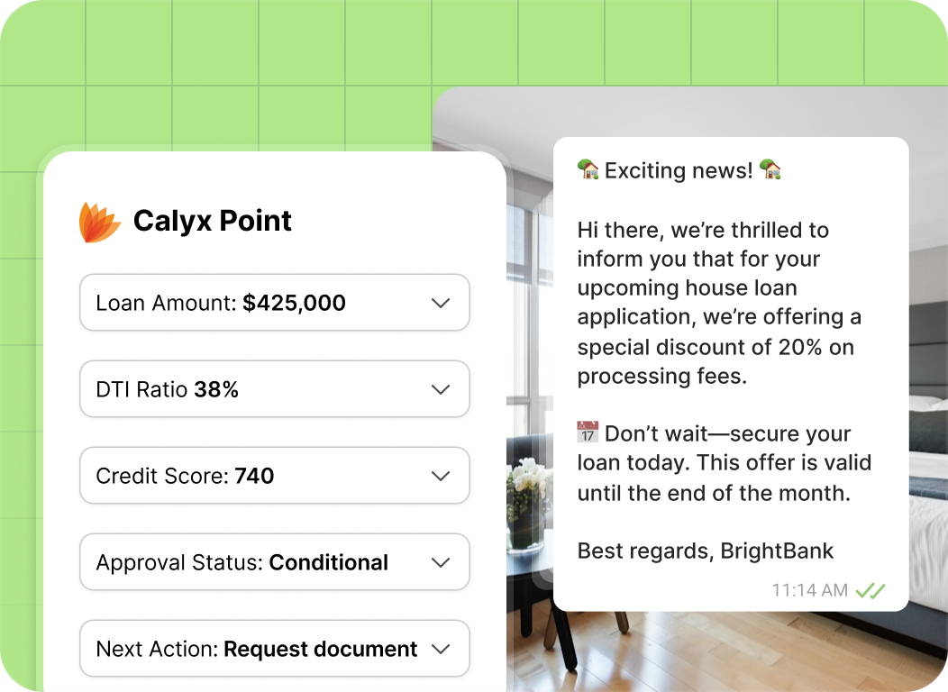 See every critical data point, DTI, LTV, approval conditions, lock expiration directly alongside your WhatsApp conversation. Answer borrower questions instantly without putting them on hold while you "pull up their files".
