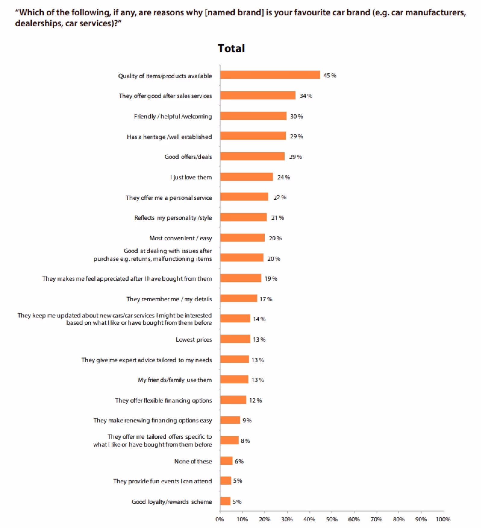 Als we kijken naar het onderzoek van de Data & Marketing Association naar waarom klanten het ene automerk boven het andere verkiezen, zien we dat kwaliteit inderdaad op de eerste plaats staat, terwijl goede service en behulpzame en gastvrije houding op de tweede en derde plaats staan. Beide wijzen op klantervaring, waaruit blijkt dat dit zwaar weegt in het besluitvormingsproces.