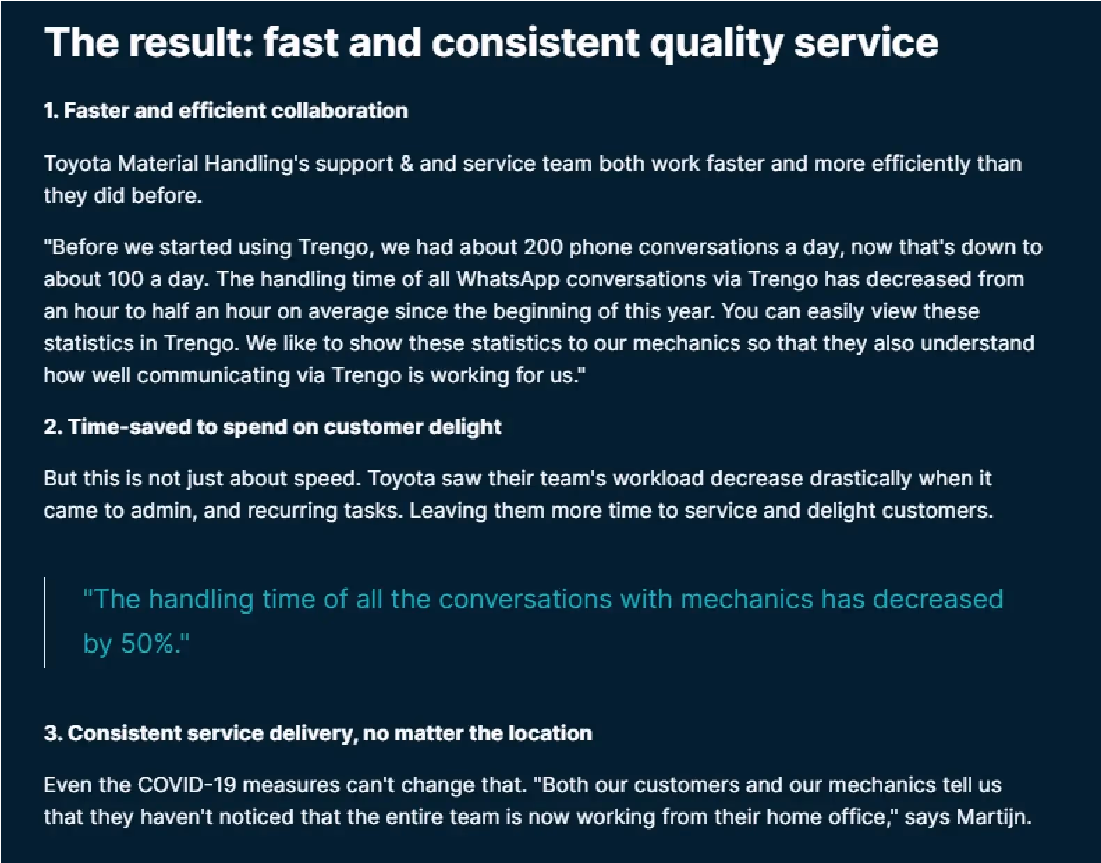 "Voordat we Trengo gingen gebruiken, communiceerden we met onze monteurs via de telefoon. Dit zorgde voor een hoge werkdruk voor onze supportteams en de processen in het veld werden hierdoor vaak vertraagd," zegt Martijn Kruijning, team lead support.