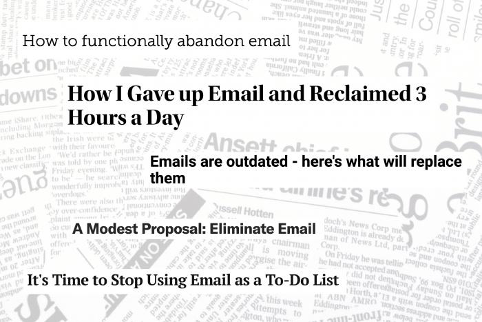 Mijn advies is duidelijk, toch? Je moet niet stoppen met het gebruik van e-mail. Het zal wereldwijd nog heel lang de meest gebruikte communicatie werkplaats zijn. We moeten het alleen anders gebruiken om er weer echt het maximale uit te halen.