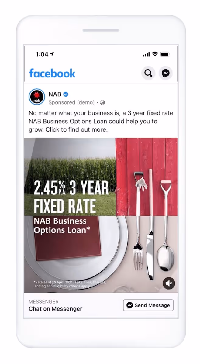 Voordien had NAB advertenties gerund met een 'Apply now' CTA die linkte naar de website van de bank. In Messenger maakten ze een Click-to-Message-advertentie om gebruikers naar een Messenger-gesprek te leiden. Eenmaal in Messenger stonden gebruikers in real-time in verbinding met een NAB Business Expert die ondersteuning bood en advies gaf over beschikbare kredietproducten. Als gevolg van deze campagne ontving NAB 6x meer leads via Messenger, en 85% van de klanten was "zeer tevreden" met hun ervaring.