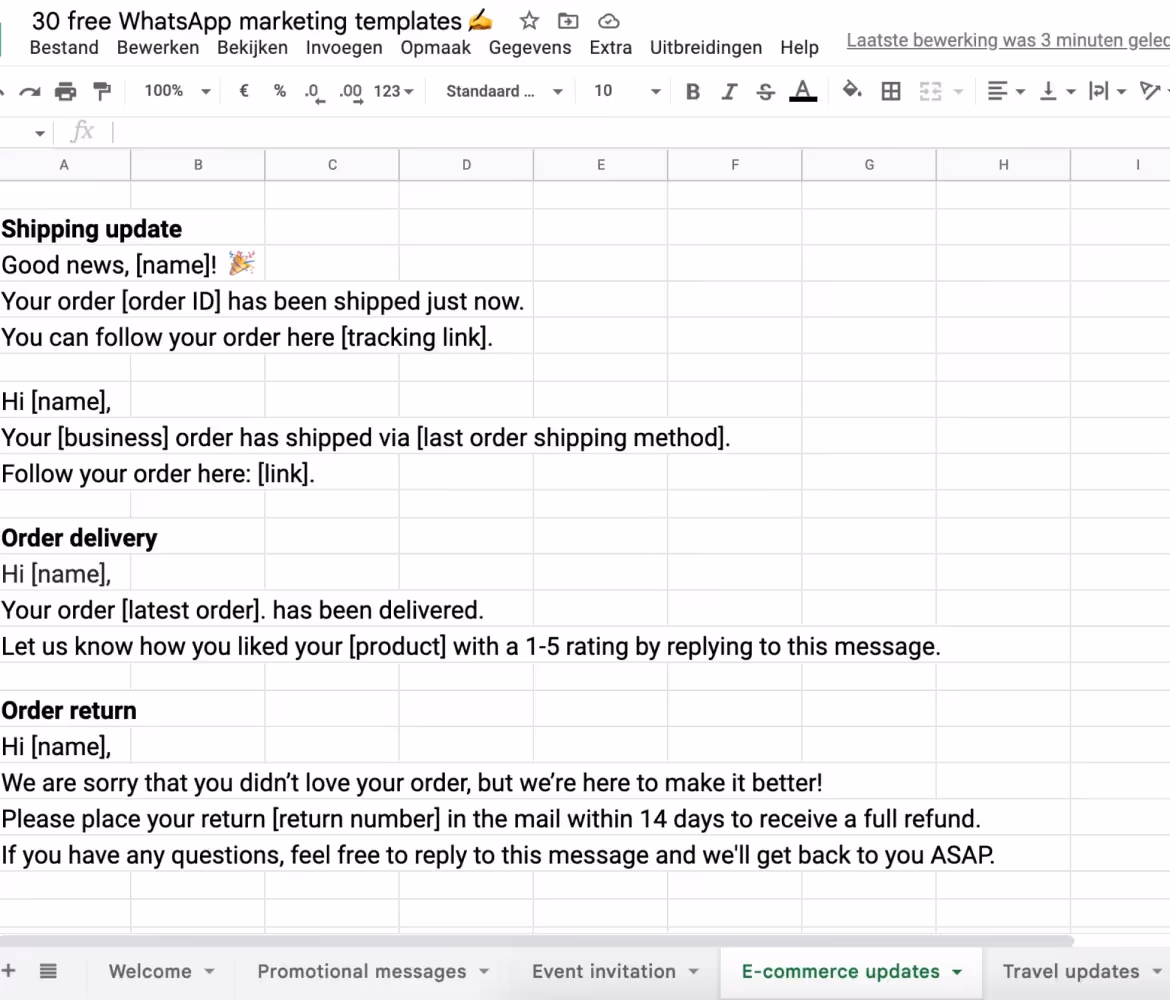 We hebben een Google sheet samengesteld met 30 gratis te gebruiken sjablonen voor Whatsapp marketing inspanningen.Laat je e-mailadres hier achter en we sturen je de sjablonen. Geen verplichtingen.
