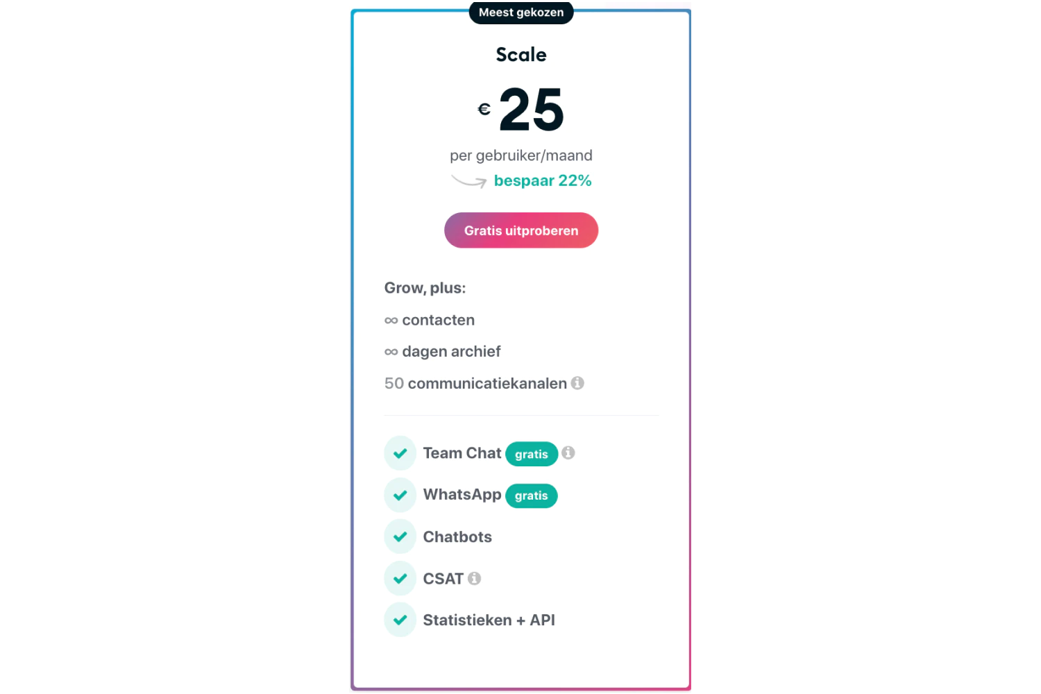 Naast het kijken naar de kosten, is het ook belangrijk om te kijken naar de functionaliteiten die elk platform biedt. Bij Userlike kun je bijvoorbeeld een WhatsApp chatbot gebruiken met een abonnement van €720 per maand. Bij Trengo kan dit al bij een abonnement van €25 per maand.