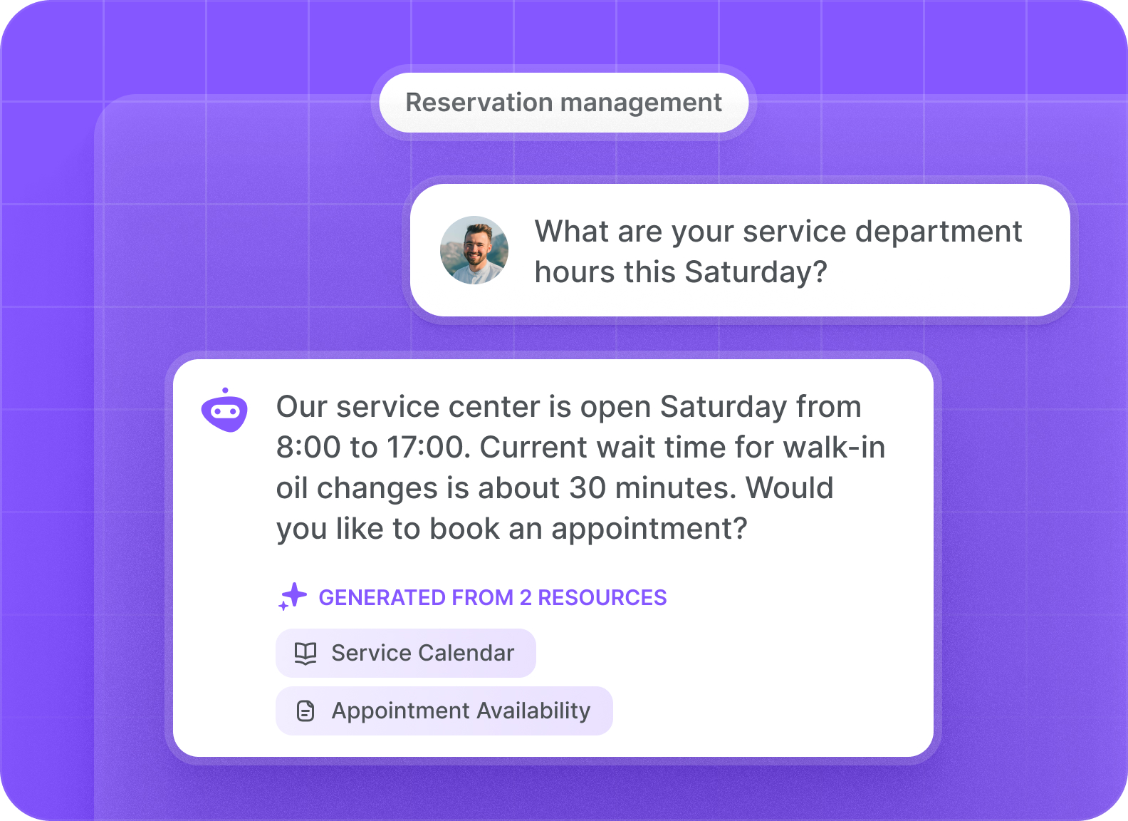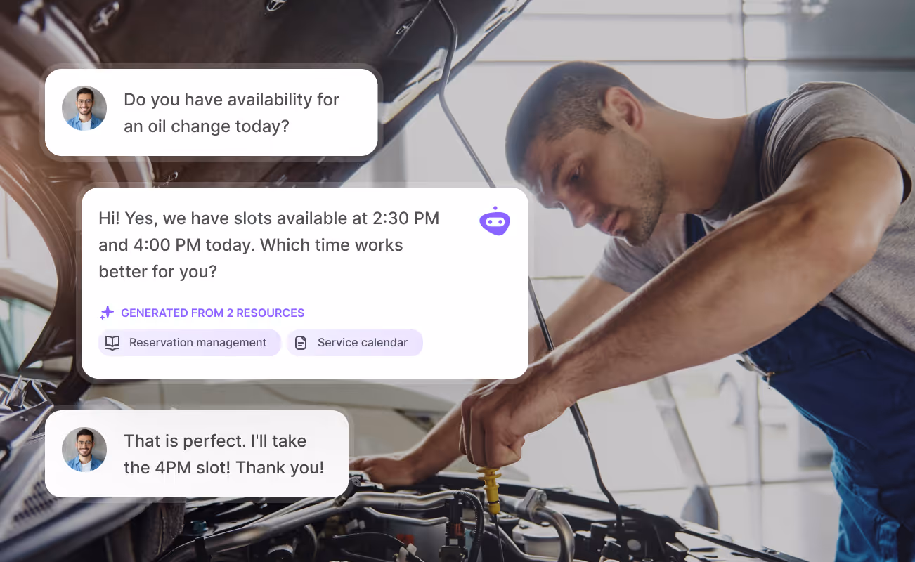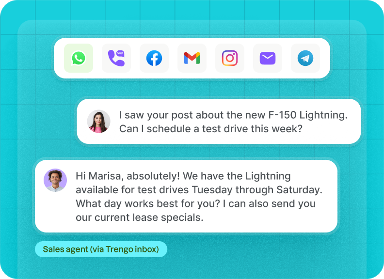 Ja. De AI van Trengo behandelt 24/7 veelgestelde vragen over de beschikbaarheid van voertuigen, onderhoudsafspraken, prijzen van onderdelen en financieringsmogelijkheden. Complexe kwesties of lucratieve verkoopkansen worden direct doorgestuurd naar je verkoop- of serviceteams, inclusief alle achtergrondinformatie, zodat je team zich alleen bezighoudt met serieuze geïnteresseerden en ingewikkelde zaken.