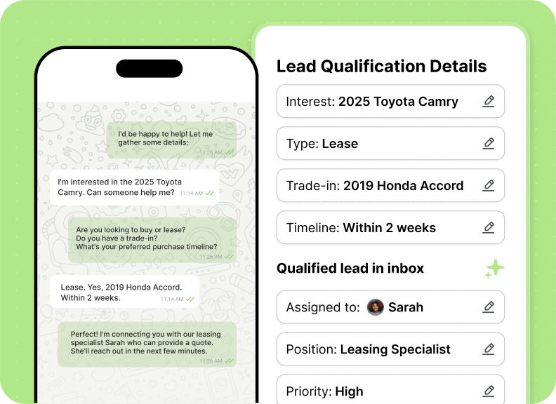 In de autobranche wordt doorgaans 80% van de standaardvragen geautomatiseerd, daalt het aantal afzeggingen voor afspraken met 40% dankzij automatische herinneringen en worden complexe verkoopvragen vijf keer sneller beantwoord. WhatsApp-campagnes halen een openingspercentage van 98%, tegenover 20% voor e-mail, wat de conversie van leads en de klantbinding aanzienlijk verbetert.