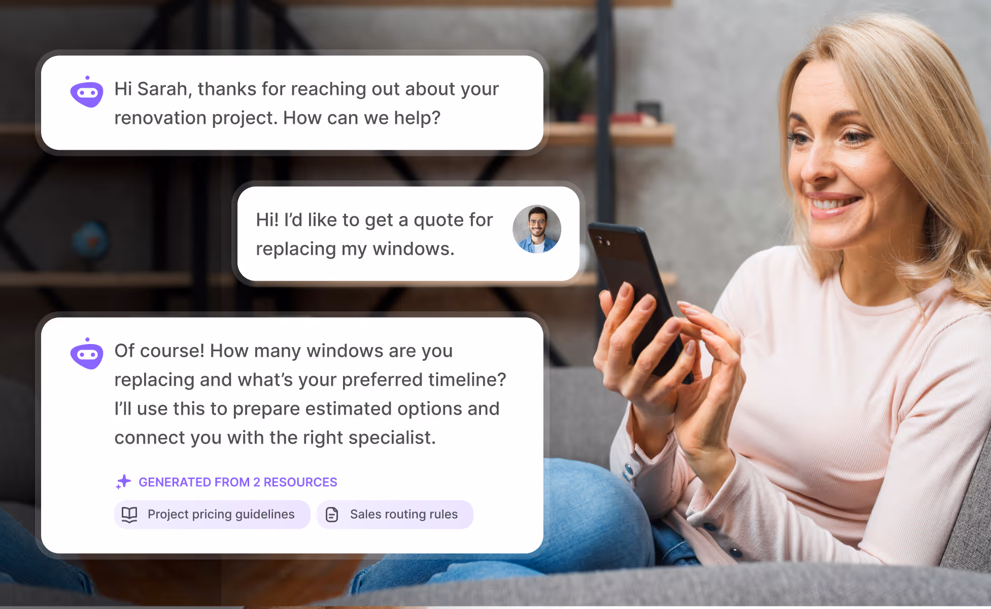 De meeste teams in de woning- en bouwsector zijn binnen 1 à 2 weken operationeel. Ons team helpt je met de integratie van je CRM-systeem, het trainen van AI met behulp van je diensten en veelgestelde vragen, en het opzetten van berichtensjablonen. Je kunt klein beginnen en de automatisering uitbreiden naarmate je verkoopproces groeit.